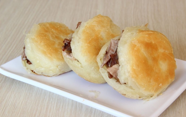 说起赤峰对夹的历史,可以追溯到100多年前。1917年,河北人苏文玉、苏德标父子到赤峰地区以卖哈达火烧为生,受河北特色小吃驴肉火烧的启发,便有了制售夹肉烧饼的想法。因儿子曾在一家饭店学过熏肉技艺,苏家就把熏肉、哈达火烧、驴肉火烧三种技艺融合在一起,创出了赤峰对夹。