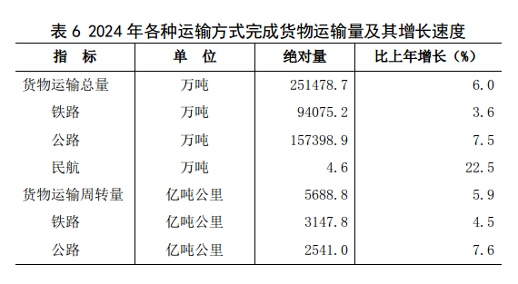 2024年全年货物运输总量25.1亿吨,比上年增长6.0%。货物运输周转量5688.8亿吨公里,增长5.9%。