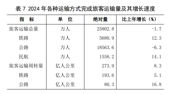 2024年全年旅客运输总量25802.8万人,比上年减少1.7%。旅客运输周转量273.9亿人公里,增长8.3%。