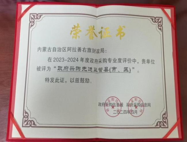 近日,由财政部指定政府采购宣传媒体《政府采购信息报》联合政府采购信息网举办的政府采购先进县(市、区)专业度评价结果揭晓,内蒙古自治区阿拉善盟阿拉善右旗凭借其出色的政府采购管理水平和卓越的创新工作能力,荣获“2023-2024年度政府采购先进县(市、区)”称号,阿拉善右旗财政局被评为“2023-2024年度政府采购突出贡献单位”。这一荣誉的取得,离不开阿拉善右旗旗委、旗政府的坚强领导和阿拉善盟财政局的大力支持和指导,获得这项荣誉不仅是对阿拉善右旗财政局在政府采购领域工作的肯定,更是对阿拉善右旗持续优化营商环境、促进旗域经济高质量发展的有力见证。