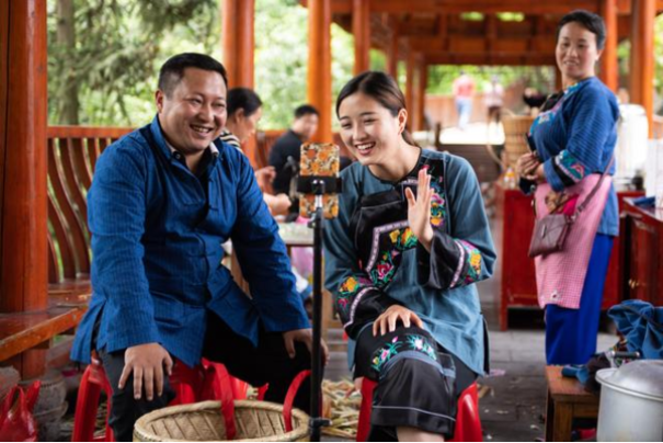 ▲2020年5月15日,在湖南湘西十八洞村,扶贫队长麻辉煌(左)与返乡大学生施林娇(中)一起直播推销土特产。新华社记者 陈思汗 摄