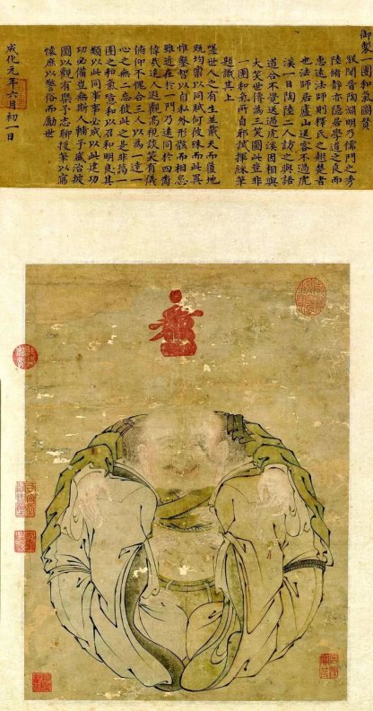 明宪宗以“虎溪三笑”的典故为灵感绘制了《一团和气图》,乍看如同一人,实为三者。