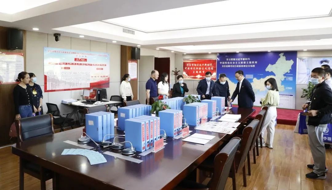 考察组一行实地了解全区直属司法行政系统学习贯彻习近平新时代中国特色社会主义思想主题教育工作进展及领导小组办公室工作情况,观看了阶段性成果展示并听取工作人员讲解,就相关工作进行深入交流。