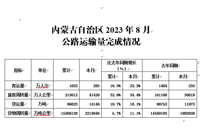 内蒙古自治区2023年8月公路运输量完成情况