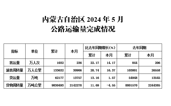 内蒙古自治区2024年5月公路运输量完成情况
