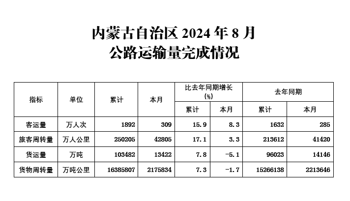 内蒙古自治区2024年8月公路运输量完成情况