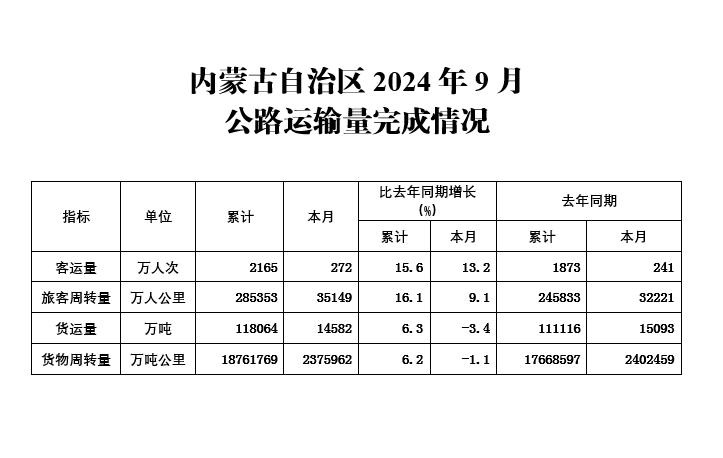 内蒙古自治区2024年9月公路运输量完成情况