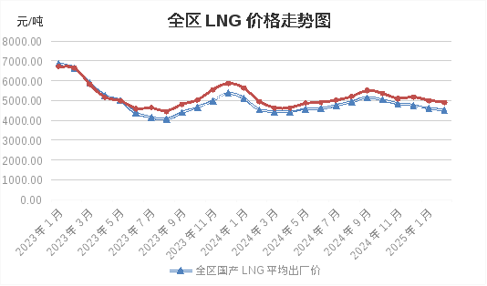 2月份,全区国产LNG平均出厂价格、LNG平均零售价格分别为每吨4508.50元、4877.47元。环比分别下降1.65%、1.89%,同比分别略降0.39%、0.88%。