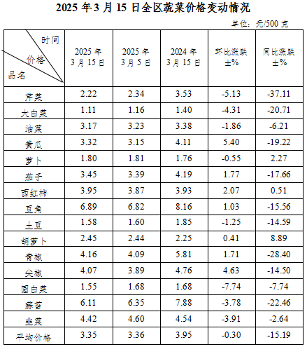 3月15日,全区蔬菜综合平均零售价格为3.35元/500克,环比略降0.30%。本旬监测的15种蔬菜品种价格7涨8降,下降幅度居前的品种为圆白菜、芹菜、大白菜、韭菜、蒜苔,分别下降7.74%、5.13%、4.31%、3.91%、3.78%。与去年同期相比,15个蔬菜品种综合平均零售价格下降15.19%。