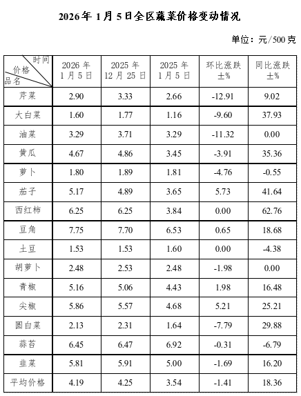 1月5日,全区蔬菜综合平均零售价格为4.19元/500克,环比下降1.41%。本旬监测的15种蔬菜品种价格4涨9降2持平,下降幅度占前五位的品种为芹菜、油菜、大白菜、圆白菜、萝卜,分别下降12.91%、11.32%、9.60%、7.79%、4.76%。与去年同期相比,15个蔬菜品种综合平均零售价格上涨18.36%。