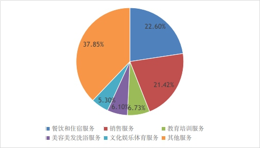 服务类投诉同比增长2.31%。投诉量排在前五位的服务大类依次为餐饮和住宿服务、销售服务、教育培训服务、美容美发洗浴服务、文化娱乐体育服务。