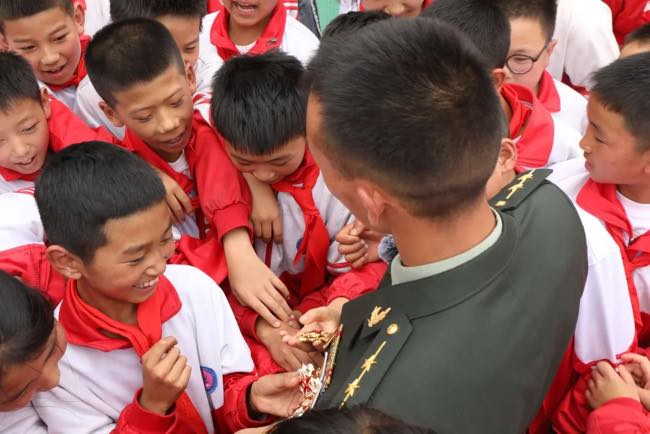 现役军人、一等功臣赵海永到双龙镇双龙小学给孩子们上国防教育课,休息期间孩子们抚摸功臣胸前的军功章。