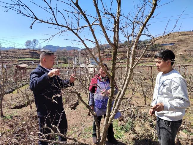 刘伟(左一)指导村民修剪石榴枝。软籽石榴种植是刘伟帮助双河村引进的产业。