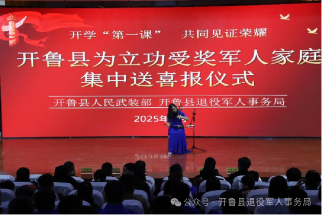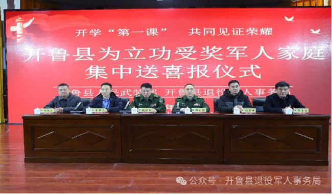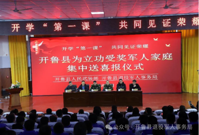 为进一步弘扬爱国拥军光荣传统,增强军人荣誉感和军属自豪感,2月21日上午,开鲁县人民武装部、县退役军人事务局、县乌兰牧骑联合在县中等职业技术学校举办立功受奖军人家庭集中送喜报活动。活动仪式由县人武部部长赵海军主持,县委常委、人武部政委田时珍、县委宣传部、县退役军人事务局、县中等职业技术学校相关负责人及荣获三等功军人、家属和师生200余人参加。