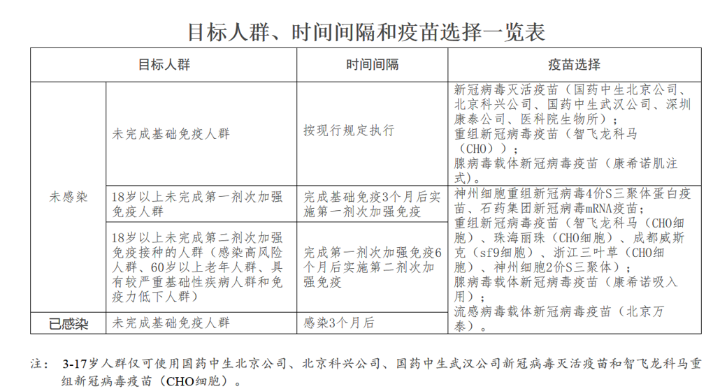 根据《关于印发应对近期新冠病毒感染疫情疫苗接种工作方案的通知》规定,新冠病毒感染疫情疫苗接种工作方案中的目标人群、间隔时间、疫苗选择事项如下表所示: