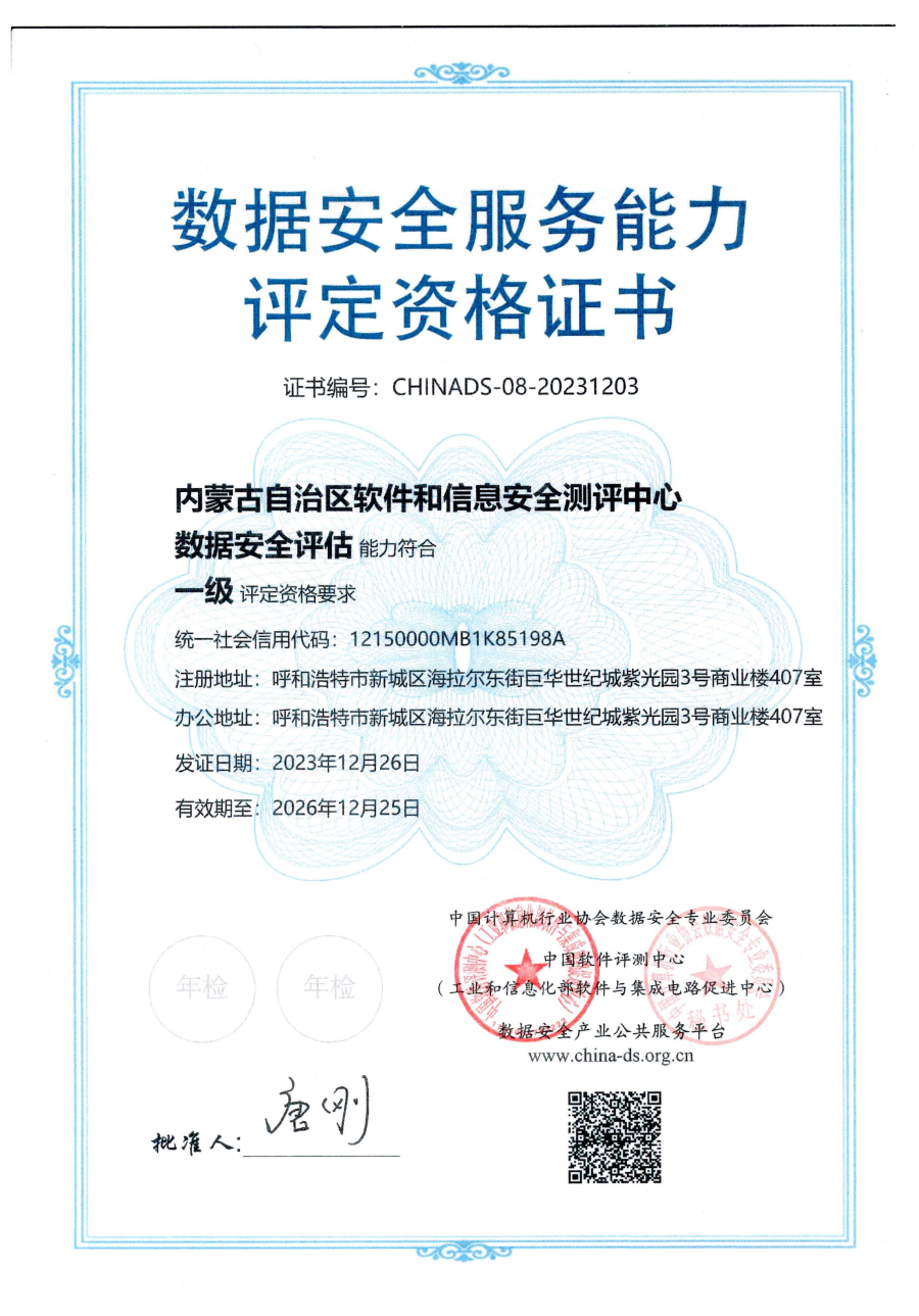 测评中心正式获得数据安全服务能力评定(一级)资格证书