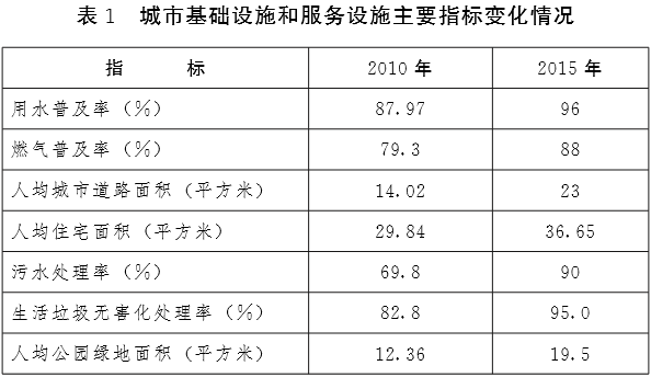 ——城镇基础设施承载能力不断提高。20个城市、69个城关镇的建成区面积较2010年扩大了16.8%。市政基础设施和公共服务设施明显改善,人均道路面积、人均公园绿地面积、垃圾无害化处理率均高于全国平均水平,城市绿地率、绿化覆盖率等指标明显提升。