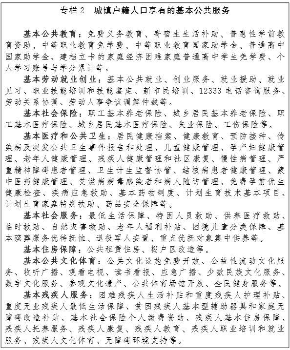 ——进城人口市民化水平显著提升。实现居住证持证人口与户籍人口基本公共服务同城均等化。义务教育、就业服务、基本养老、基本医疗卫生、保障性住房等基本公共服务覆盖城镇全部常住人口。
