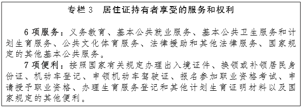 全面推进居住证持有者逐步享有城镇居民公共服务。深入落实《 关于全面做好居住证制度实施工作的意见》,确保居住证持有人享有与当地户籍城镇人口同等的劳动就业、基本公共教育、医疗卫生服务、计划生育服务、公共文化服务、证照办理服务等权利。推动持证人口逐步享有与当地户籍人口同等的中等职业教育资助、就业扶持、住房保障、养老服务、社会福利、社会救助等权利。结合随迁子女在当地连续就学年限等情况,推动持证人口逐步享有随迁子女在当地参加中考和高考的资格。(公安厅、人社厅、民政厅、教育厅、卫计委)