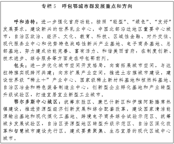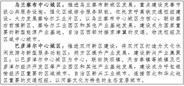 呼包鄂城市群。以呼和浩特市、包头市、鄂尔多斯市中心城区和准格尔旗薛家湾、大路为节点,积极争取在呼和浩特建设国家级新区,完善呼和浩特市核心地位,强化包头市、鄂尔多斯市区域副中心城市地位,培育鄂尔多斯市(含阿勒腾席热镇)成为大型城市,加快推进准格尔旗“撤旗设市”,构建“四足鼎立”的“井”字型城市群核心层。以呼包鄂基础设施互联互通为基础,以同城化建设为载体,以优化要素配置为核心,以区域统一市场构建为重点,着力推动呼包鄂城市群基础设施共建共享、生态环境联保共治、产业互补协作、基本公共服务均等化,整合区域创新资源,推进创新资源共享,显著提升区域整体竞争力和发展活力,实现呼包鄂城市群协同发展。将托克托县、和林格尔县、土默特左旗、土默特右旗、伊金霍洛旗、达拉特旗和凉城县、卓资县的城关镇打造成为功能复合的卫星城。加强乌海市、巴彦淖尔市、乌兰察布市、阿拉善盟与呼包鄂城市群基础设施互联互通,推动临河区—杭锦后旗、集宁区—察右前旗一体化建设,辐射带动旗县城关镇和其他建制镇发展。到2020年,呼包鄂城市群城镇人口达到1000万人以上,形成以呼和浩特市、包头市、鄂尔多斯市三个大城市为核心,覆盖沿黄河沿交通干线经济带规划区域,与京津冀城市群衔接的西部大开发支点城市群。(发改委、住建厅、民政厅)
