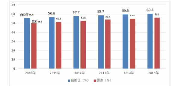 ——城镇化率显著提高。2015年,全区户籍人口城镇化率达到44.16%,比2010年提高3个百分点;城镇常住人口增加到1514.16万人,城镇常住人口比重达到60.3%,比2010年提高4.8个百分点。2015年户籍人口城镇化率和常住人口城镇化率均比全国高约4个百分点,在西部省区居第二位。