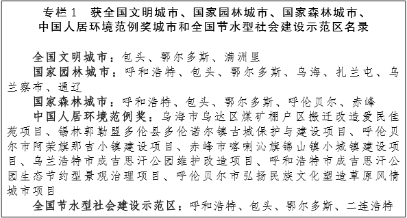 ——城市面貌显著改观。3个城市被评为全国文明城市,7个城市进入“国家园林城市”行列,5个城市进入“国家森林城市”行列,7个城市建设项目获得“中国人居环境范例奖”,4个城市荣获“全国节水型社会建设示范区”称号。