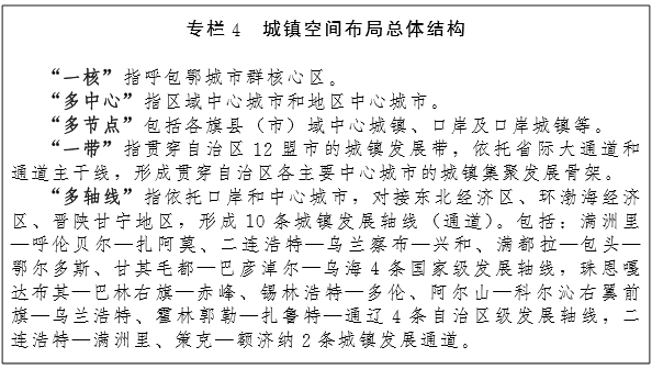 ——城镇布局更加协调。基本形成以呼包鄂城市群为核心,区域中心城市、小城市、特色城镇形态各异、协调发展的新型城镇体系。城市数量增加到25个左右,城市规模结构更加完善,区域中心城市辐射带动作用更加突出,大中小城市数量增加,特色小城镇格局基本形成。