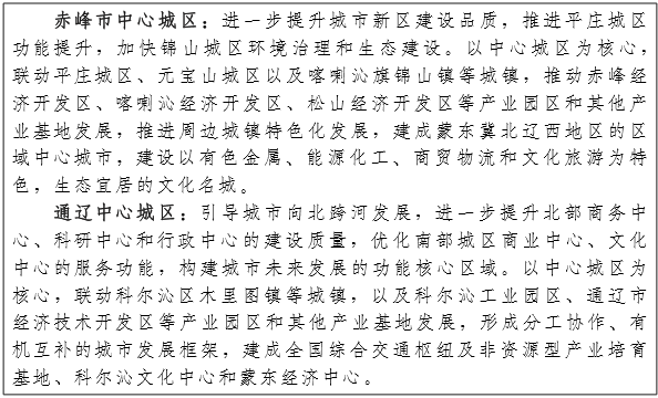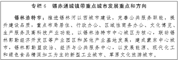 锡赤通城镇带。通过城市规划和区域规划调整,推动锡林浩特市—正蓝旗—多伦县、赤峰中心城区—喀喇沁旗、通辽科尔沁区—通辽经济技术开发区—奈曼旗一体化建设,形成锡赤通城镇带核心。建设综合快速交通系统,缩短三盟市之间及对外经济距离,促进要素相向流动,形成以锡林郭勒盟、赤峰市、通辽市中心城区为中心,以旗县城关镇为节点,向村镇延伸,融入环渤海和东北经济区的锡赤通城镇体系框架。到2020年,锡赤通城镇带成为自治区东部盟市重要经济增长极,赤峰市、通辽市、锡林浩特市打造成为我国东北地区重要城市。(发改委、住建厅、经信委、交通厅)