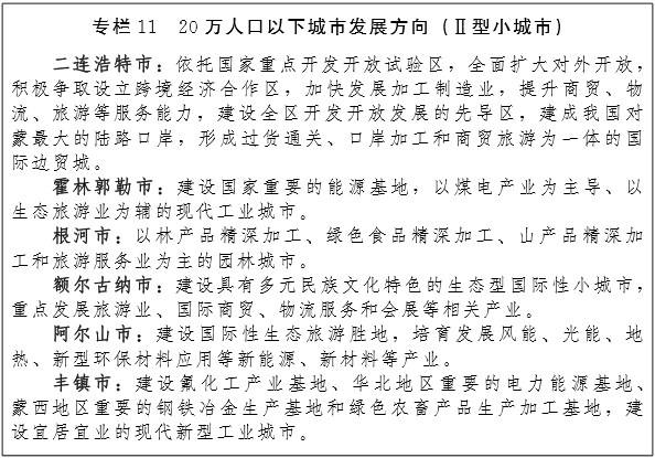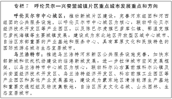 呼伦贝尔—兴安盟城镇片区。着力打造贯通大兴安岭岭西与岭东的环型交通体系,建设海拉尔地区—满洲里市—牙克石市—额尔古纳市—根河市—扎兰屯市—阿尔山市—乌兰浩特市“呼兴生态文化旅游城镇圈”。充分发挥满洲里国家开发开放试验区的先行先试作用,建设中俄蒙开放先导区,建成“亚欧大陆桥”的重要枢纽。通过城市规划和区域规划调整,推动海拉尔区—呼伦贝尔经济开发区—鄂温克旗、乌兰浩特市—科右前旗一体化建设。有序引导大兴安岭林区人口转移,优先引导人口向本地旗县(市)域中心城镇及小城市转移,鼓励人口向呼伦贝尔市中心城区、乌兰浩特等中心城区和牙克石市、扎兰屯市等周边重点城镇转移。到2020年,把呼伦贝尔市、乌兰浩特市建成具有较强竞争力的中等城市。(发改委、住建厅、旅游局、交通厅)