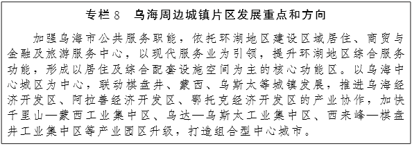 乌海周边城镇片区。加强区域整合和跨界协调,全面实施乌海及周边城镇规划,打造以乌海为中心,以乌斯太镇、鄂托克旗经济开发区和部分建制镇为节点,与宁夏、甘肃沿黄城市要素相向流动的城镇片区。发挥乌海市产业和人口综合服务基地作用,建立要素聚集、资源整合、环境共治和利益共享机制,着力打造自治区“产城融合”示范区。(住建厅、经信委、发改委、交通厅、环保厅)