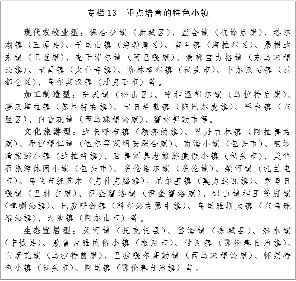 有重点地发展小城镇。发挥小城镇连接城乡的关键节点作用,坚持分类指导、差别化发展、择优培育,引导小城镇走特色化、集约化、现代化的发展道路。加强中心城市周边小城镇的统筹配套发展,增强为周边农村牧区提供服务能力,逐步建设成为卫星城。推动远离中心城市的重点镇,通过提升服务功能,发展成为面向周边农村的生产生活服务中心。重点镇要依靠毗邻的城市,坚持与特色产业发展相结合、与服务“三农三牧”相结合,建设成为发展现代农牧业、推进城乡一体化、促进农牧民就近就地城镇化的重要载体。对吸纳人口多、经济实力强的镇,赋予同人口和经济规模相适应的管理权。到2020年,全区形成60个左右的旗县(市)域中心城镇、189个左右的重点镇、235个以上其它小城镇。(住建厅、民政厅、发改委、交通厅)