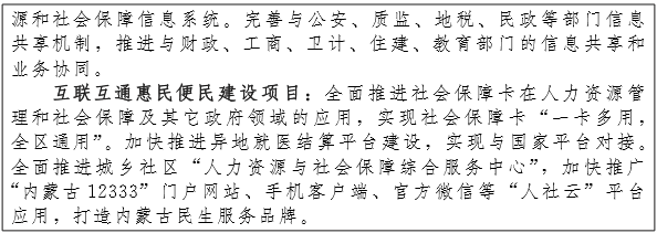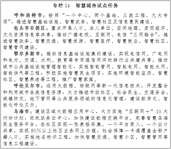 推动智慧城市试点。深入推进呼和浩特、鄂尔多斯、乌海、呼伦贝尔、包头石拐区等智慧城市试点,推动物联网、云计算、大数据等新一代信息技术创新应用,实现城市化与信息化高度融合。推进“互联网+” ,完善政府门户网站、网上审批、信息公开、网上信访等公共服务平台建设,逐步实现基本公共服务事项网上办理和“一号一窗一网”目标。实施“数字交通”工程,完善交通指挥综合管理系统,应用推广高速公路不停车收费系统(ETC)、公交一卡通等智能交通系统,建立交通诱导、应急指挥、智能出行和公交管理等智能化城市交通综合管理系统。完善金土、金财、金税、金保等政务管理信息工程,强化国土、海关、工商、税务、社会保障等重点信息系统建设和整合,加强对食品、药品、医疗器械等电子化监管,实施数字化食品药品放心工程。完善智慧民生服务平台,健全公共就业信息服务平台、养老服务机构信息服务平台、旅游服务平台、住房信息系统、社会信用信息平台、市民服务中心、法律帮扶平台、职工维权帮扶平台和智慧社区公共服务综合信息系统等专业化公共服务平台;推进智慧医院、远程医疗平台建设,普及电子病历、健康档案、医保和社会保障一卡通服务。建设智慧教育文化体系。完善教育综合信息网、网络学校、数字化课件、教育资源库、虚拟图书馆、教学综合管理系统、远程教育系统、全民阅读数字平台等资源共享数据库及共享应用平台,深化文化“共享工程”建设,推进先进网络文化发展,加强新闻出版、广播影视、电子娱乐等信息资源整合。建设智慧安全防控体系,推进应急指挥系统、突发公共事件预警信息发布系统、自然灾害和防汛指挥、安全生产重点领域防控体系等智慧安防体系建设,提高对各类事故、灾害、疫情和突发事件的防范和应急处理能力。整合公安监控和社会监控资源,推动公共安全视频监控建设联网应用。健全网络和信息安全标准体系建设,加大依法管理网络和保护个人信息力度,加强要害信息系统和信息基础设施安全保障,确保安全可控。力争到2020年试点城市基本建成公共服务便捷化、基础设施智能化、城市管理精细化、网络安全长效化的智慧城市。(住建厅、发改委、经信委、通信管理局)