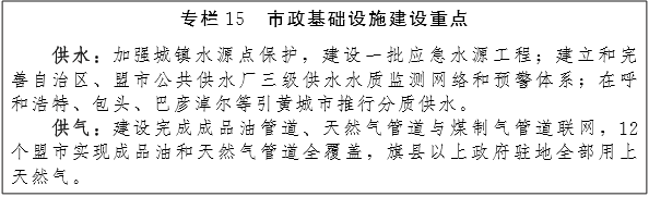 加强水、电、气和污水、垃圾处理等设施建设。建设用水安全保障体系,加强城镇水源点保护,加快城镇供水设施改造和建设,建设一批应急水源工程,提高供水能力和供水质量,到2020年城镇公共供水普及率达到99%。建立完善自治区、盟市公共供水厂三级供水水质监测网络和预警体系。在呼和浩特、包头、巴彦淖尔等引黄城市推行分质供水。预留城市电力基础设施建设空间,加强城市配电网建设,协调布置各电压等级线路,大电网入地和整合高架工作力度,加快规划建设城市电动汽车充电网点。推进城镇污水处理设施建设,加强再生水、疏干水和劣质地下水的开发利用,到2020年城镇污水处理率达到90%,城镇污水再生水利用率达到40%。完善城镇防洪设施,提高建设标准,加大雨污分流改造力度。开展存量生活垃圾治理示范项目,推广生活垃圾分类收集处理,提高垃圾处理设施建设和运营管理水平。到2020年生活垃圾资源化率达到30%,医疗垃圾无害化处理率达到100%。加快城镇天然气管网、液化天然气站等设施建设,到2020年城镇燃气普及率达到90%,所有旗县均通天然气。加强集中供热设施升级改造,支持煤改气、煤改电、热电联产项目建设。(住建厅、环保厅、发改委)