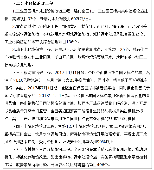 推进重点流域综合治理。全面推行河长制管理制度,强化地方水环境保护属地责任,实施“一河一策”,确保到2018年底前,全面建立自治区、盟市、旗县(市、区)、乡镇(苏木)四级河长体系。进一步改善松花江、黄河中上游、辽河水质,推进海河、昆都仑河、总排干渠等重污染水体的治理力度,切实抓好呼伦湖、乌梁素海等重点湖泊综合治理和生态修复,到2020年呼伦湖、乌梁素海汇水范围内总氮减少10%。