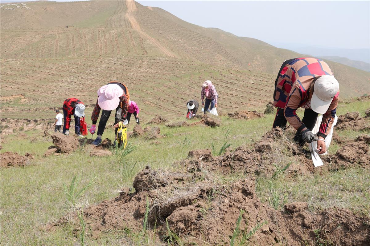 7月10日,记者来到位于卓资县卓资山镇麻迷图村的浑善达克沙地综合治理项目柠条种植现场看到,起伏不平的山坡,经过挖掘机整地、翻耕作业后,一个个小土坑整齐排列,工人们正在播撒柠条种子,一片繁忙景象。