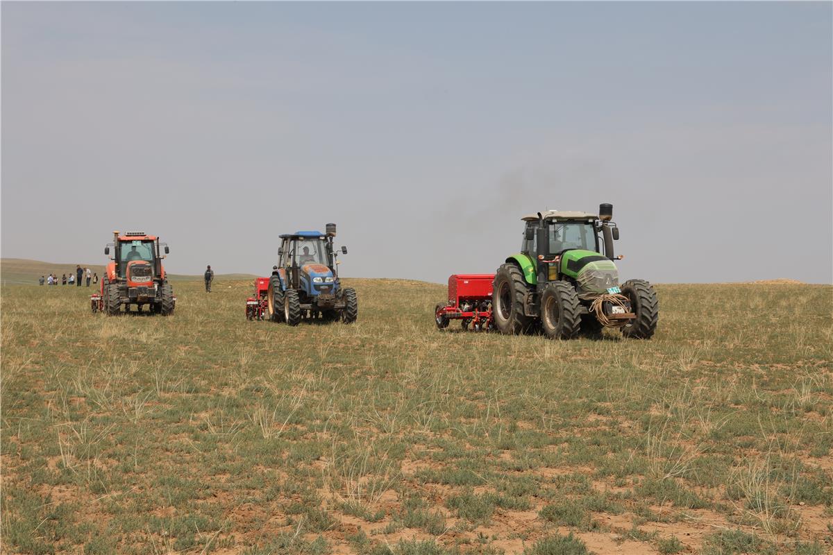 7月11日,记者来到位于四子王旗查干补力格苏木巴音嘎查的防沙治沙和风电光伏一体化项目种草现场看到,几台后边拖着免耕补播机的大型拖拉机聚集在这里,拖拉机驾驶员经过检查机械、添加草种子等准备工作后,启动拖拉机驶向田野,开启种草作业。