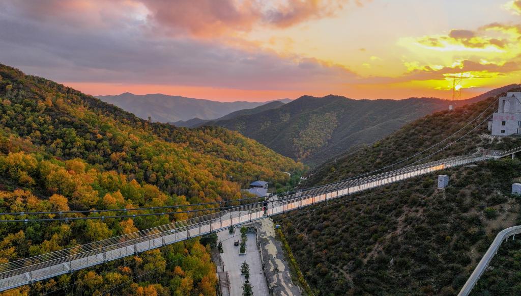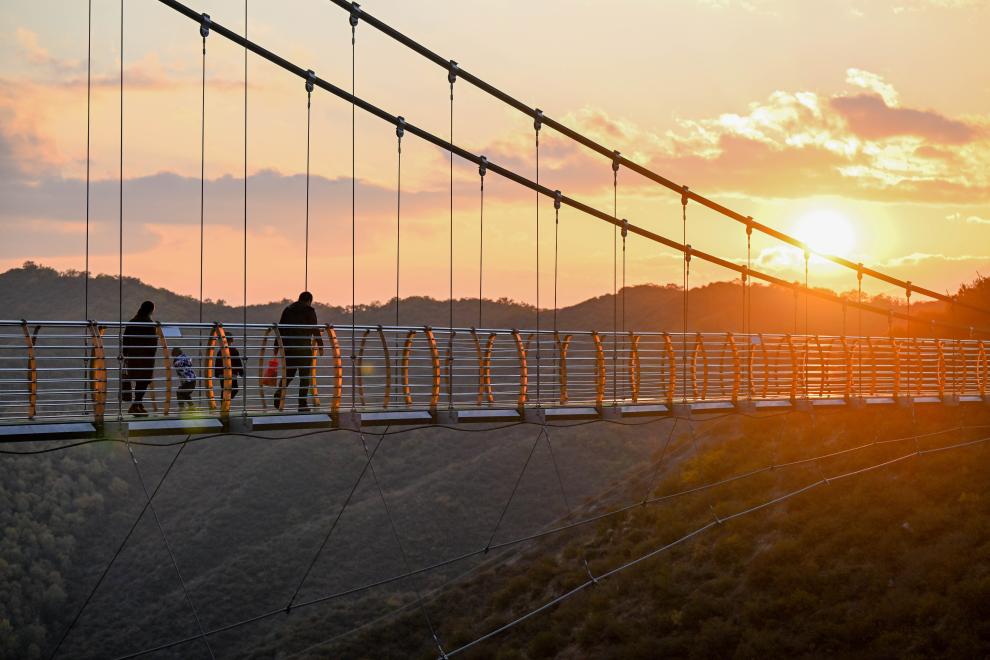10月6日,游人在林胡古塞旅游区内的玻璃桥上行走。新华社记者 连振 摄