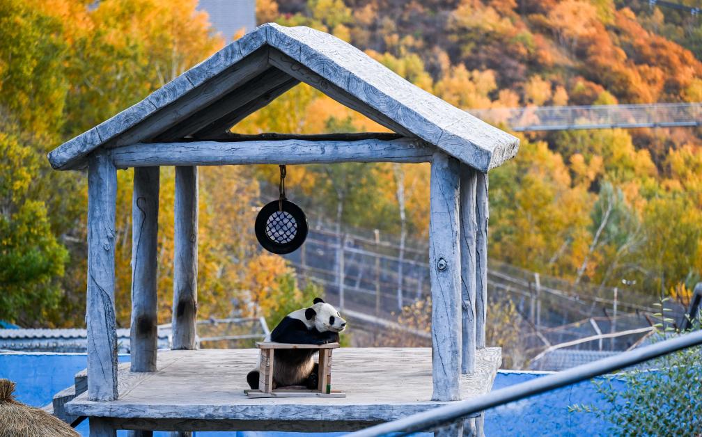 10月6日,一只大熊猫在林胡古塞动物园内休憩。新华社记者 连振 摄