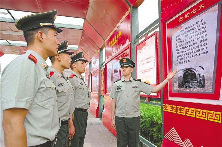 连日来,武警内蒙古总队阿拉善支队以多种形式开展主题党日活动,官兵们通过重温入党誓词、观看红色电影、参加主题演讲、进行文艺汇演等,共同回顾了中国共产党的光辉历程,学习党的先进理论,进一步坚定信仰,强化使命担当。图为官兵们在营区文化长廊参观党史宣传展板。