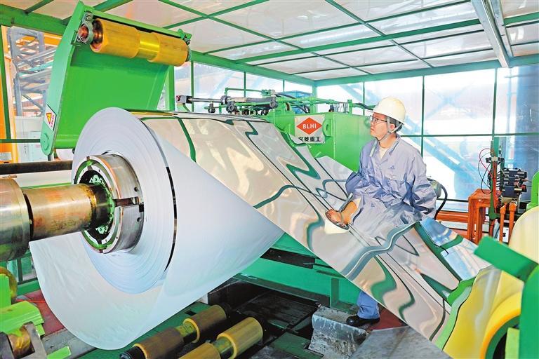 甘肃甬金金属科技公司工人检查刚轧成的不锈钢板带成品。嘉峪关市大力优化营商环境,精准招商,引进浙江甬金科技集团股份公司投资建立延链企业。(记者田蹊)