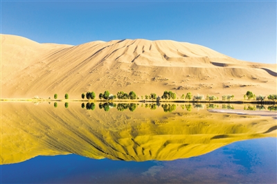 秋日的巴丹吉林沙漠沙海莽莽、水天相映,景色壮美。