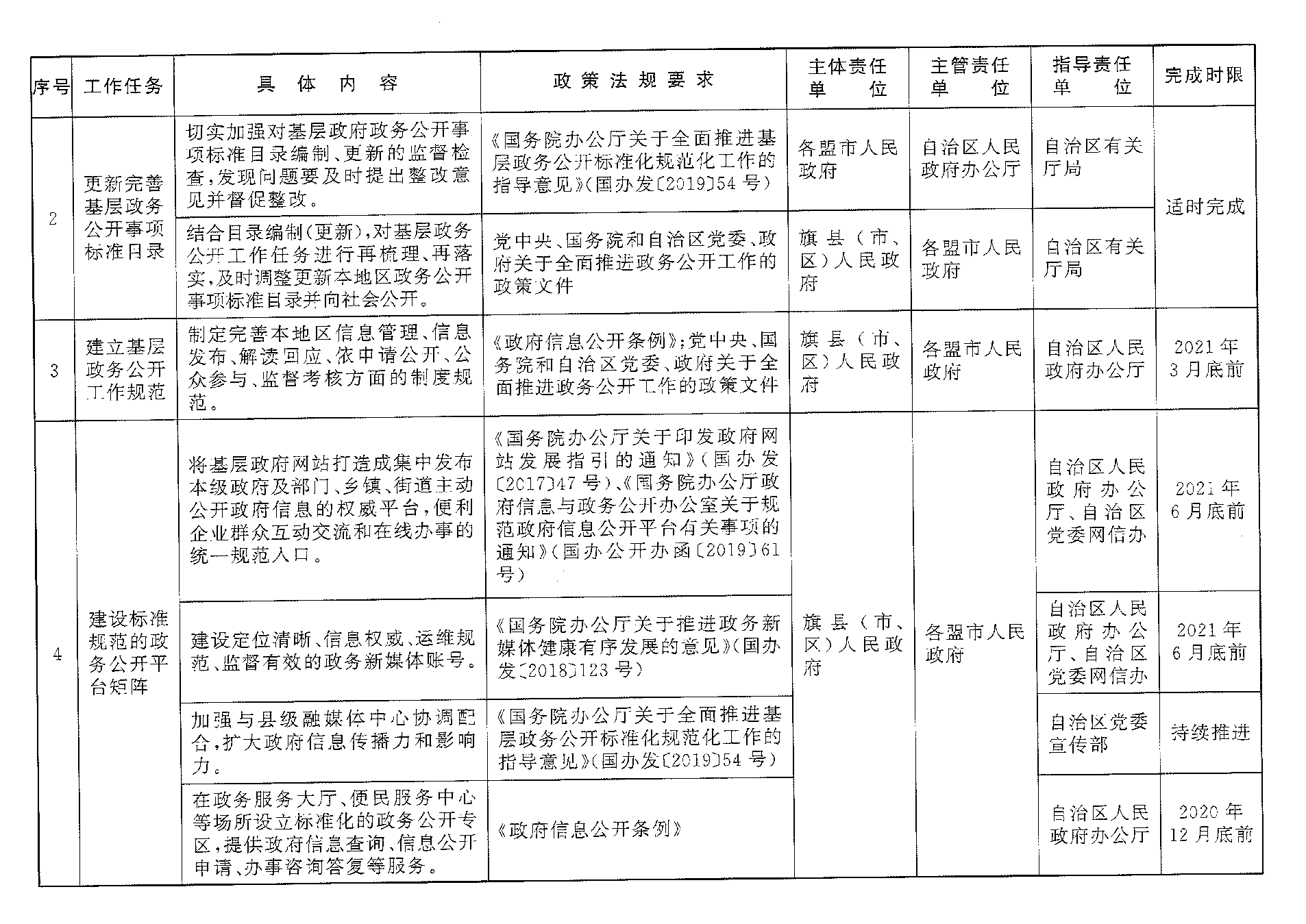 (一)建立基层政务公开工作规范。基层政府要严格落实国家和自治区关于全面推进政务公开工作的要求,认真贯彻执行《政府信息公开条例》,制定完善本地区信息管理、信息发布、解读回应、依申请公开、公众参与、监督考核等方面的制度规范,于2021年3月底前在本地区政府信息公开平台向社会公开。同时,鼓励将政务公开事项标准目录及制度规范嵌入部门业务系统,并适时列入政府绩效考核政务公开指标体系,促进公开工作与其他业务工作融合发展。