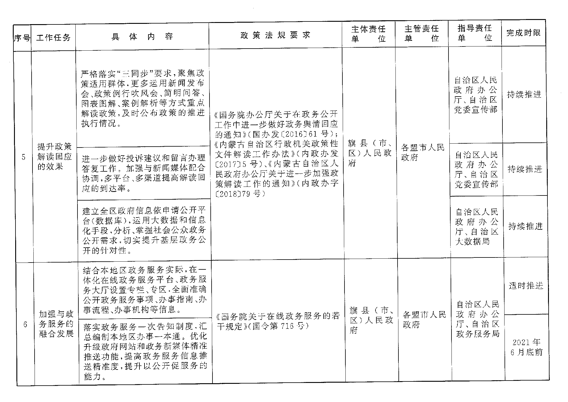 (二)加强与 的融合发展。结合本地区 实际,在一体化在线 平台、 大厅设置专栏、专区,全面准确公开 事项、办事指南、办事流程、办事机构等信息。落实 一次告知制度,于2021年6月底前汇总编制本地区办事一本通。优化升级政府门户网站和政务新媒体精准推送功能,提高 信息推送精准度,提升以公开促服务的能力。