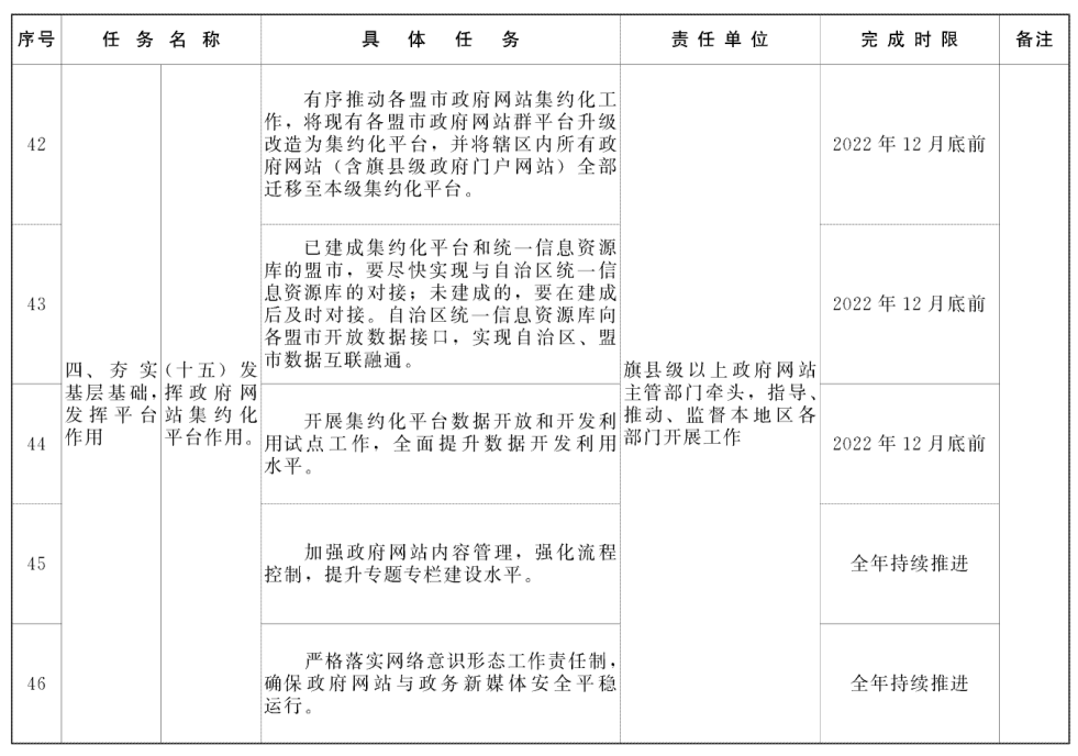 (十五)发挥政府网站集约化平台作用。有序推动各盟市政府网站集约化工作,将现有各盟市政府网站群平台升级改造为集约化平台,并将辖区内所有政府网站(含旗县级政府门户网站)全部迁移至本级集约化平台。已建成集约化平台和统一信息资源库的盟市,要尽快实现与自治区统一信息资源库的对接;未建成的,要在建成后及时对接。自治区统一信息资源库向各盟市开放数据接口,实现自治区、盟市数据互联融通。开展集约化平台数据开放和开发利用试点工作,全面提升数据开发利用水平。加强政府网站内容管理,强化流程控制,提升专题专栏建设水平。严格落实网络意识形态工作责任制,确保政府网站与政务新媒体安全平稳运行。