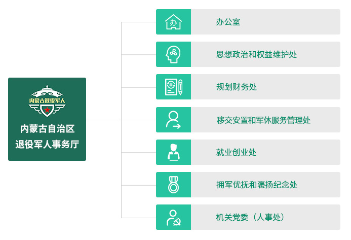 机构设置:内设综合科、权益与信访科、军休与安置科、自主择业与企业军转科、就业创业培训科、优抚褒扬科、信息科7个科室。