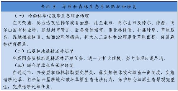 继续实施京津风沙源治理等重点工程,推广库布其沙漠治理方式和沙产业模式,推动浑善达克、乌珠穆沁、呼伦贝尔沙地治理。推进规模化林场建设,采取人工造林、封沙育林、飞播造林等方式恢复植被。建设荒漠绿洲防护林、防风固沙林、沙漠锁边林、农田草牧场防护林以及水土保持林。以干旱半干旱草原为重点,加强草场改良和人工种草,实行围封禁牧、划区轮牧、季节性休牧、舍饲圈养等措施,保护和恢复草原植被。以内蒙古高原等为重点,推进防护林体系建设及退化林修复、退化草原修复、京津风沙源治理。新增水土流失综合治理3.33万平方公里。